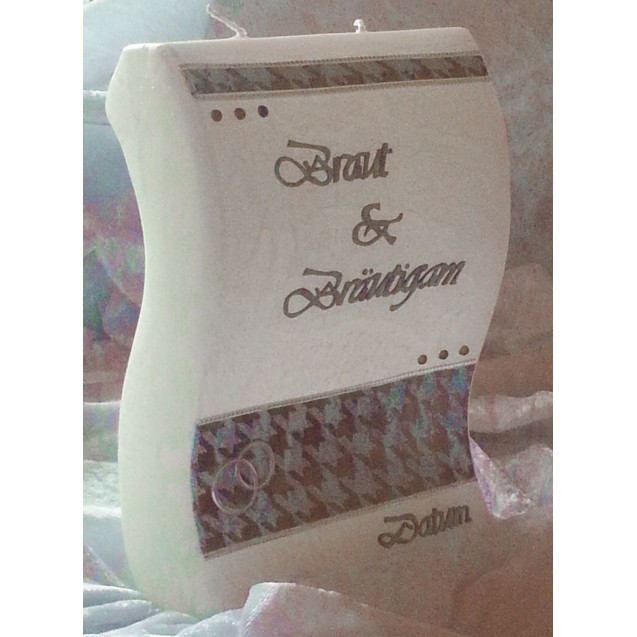Eine aussergewöhnliche Hochzeitskerze in aufrechter Wellenform mit 2 Dochte und einer Stearin-getauchten Oberfläche. Die Dekoration erinnert an die Hahnentritt-Muster der 50er-Jahre und entspricht somit dem modernen Vintage-Stil. Die Farbe des Wachses ist ein metallisches Kupfer mit irisierendem Silber, die Schrift mattsilber. Die Swarovski-Steine bilden die kupferfarbigen Glanzpunkte dieser beeindruckenden Brautkerze.