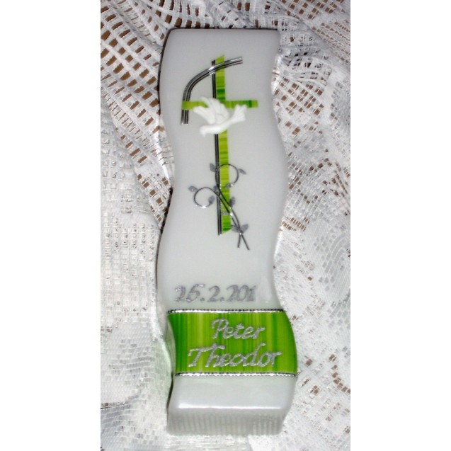 Kerze 470/30mm in grün/silber, weiße Taube